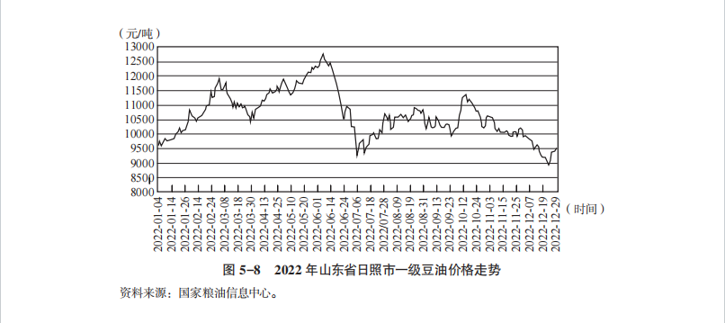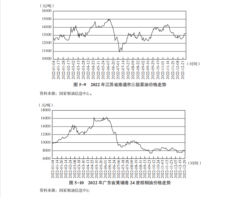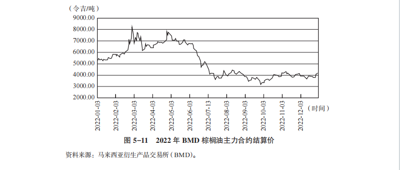 2020 年 5 月以来,国内外植物油市场经历了两年的牛市行情,到 2022年 6 月初,豆油、棕榈油、葵花子油等植物油国际市场价格均升至历史高位,部分品种刷新历史最高纪录。下半年,随着印度尼西亚放开植物油出口,美联储持续加息加剧全球经济衰退预期等,植物油国际市场价格大幅回落。12 月 30 日,马来西亚衍生产品交易所(BMD)棕榈油期货主力合约报收 4176 令吉 / 吨,较 4 月底的年内高点下跌 41.2%,比年初下跌13.9%(见图 5-11)。